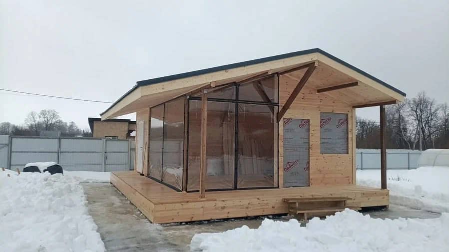 Он крепится к постройке, а окна, в свою очередь, к брусу.